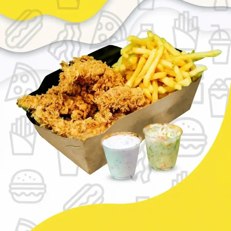 6 crispy chickens. With french fries, ranch sauce, coleslaw